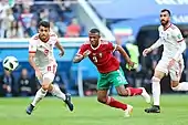 In May 2018 he was named in Morocco's 23-man squad for the 2018 FIFA World Cup in Russia.[37][38] He played only 2 matches out of the 3 in the World cup, played the first match as the starting 11 against Iran and coming on the 69th minute as substitute for Khalid Boutaib against Portugal.