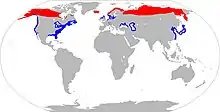 The greater scaup has a circumpolar distribution, breeding within the Arctic Circle both in the Old World (the Palearctic) and in North America (the Nearctic). It spends the summer months in Alaska, Siberia, and the northern parts of Europe. It is also found in Asia and is present in the Aleutian Islands year round.[17] The summer habitat is marshy lowland tundra and islands in fresh water lakes. In the fall, greater scaup populations start their migration south for the winter. They winter along the Pacific and Atlantic coasts of North America, the coasts of northwest Europe, the Caspian Sea, the Black Sea, the coast of Japan, Yellow Sea and East China Sea.[18] During the winter months, they are found in coastal bays, estuaries, and sometimes inland lakes,[19] such as the lakes of Central Europe and the Great Lakes.[18]