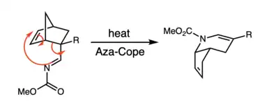 The 3-aza-Cope reaction was discovered soon after the 2-aza-Cope rearrangement was identified, due to its analogous relationship to the Claisen rearrangement. Indeed, in early papers, this version of the aza-Cope rearrangement is often referred to as the amino-Claisen rearrangement, a misrepresentation of the rearrangement, as this would imply that both a nitrogen and oxygen are in the molecule.[3] This rearrangement can be used to form heterocyclic rings involving carbon, most commonly piperidine.