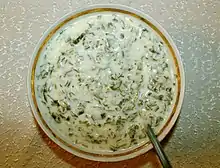 Dovga A yogurt-based soup with sorrel, spinach, rice, dried peas, and small meatballs made from ground mutton; served hot or cold depending on the season.[10]