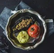 Badımcan Dolması Tomato, sweet pepper, and aubergine stuffed with minced lamb or beef mixed with chickpeas.