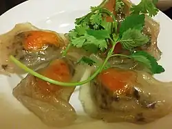 Bánh bột lọc is a small, clear-looking, chewy tapioca dumplings in Vietnamese cuisine that can be eaten as appetizers or small snacks. They are usually filled with shrimp and pork belly, often being topped with fried shallots and served with sweet chili fish sauce. It is said to have originated from Huế, as the city was once the imperial capital of the Nguyễn dynasty and known for having simple, yet sophisticated dishes.[1][2]
