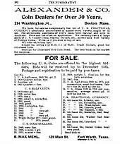 Mehl's first published words in The Numismatist appeared in August 1903. Likely part of a letter to Secretary Heath endorsing the magazine, they read, "I am indeed more than pleased with The Numismatist and think it is the best publication of its kind."[1] In October 1903, that journal reported a change of address for Mehl to Box 24, Alvord, Texas. In 1903, he joined the British Numismatic Society.[1] Mehl's first mail-order advertisement appeared in the December 1903 issue of The Numismatist, selling 33 U.S. coins on a highest-bidder basis. Q. David Bowers, in a 1999 article on Mehl, found it logical that Mehl would focus on the mail order business given Fort Worth's distance from numismatic centers such as New York and Philadelphia—there would be few local collectors to patronize a coin shop in "Cow Town", as Fort Worth was known.[4] By this time Mehl had returned to using the address on Main Street in Fort Worth. The sale was likely not a success, as most of the coins were listed on a circular Mehl sent by mail in January 1904, but the following month, he placed his first full-page advertisement in The Numismatist. According to numismatic author John N. Lupia III, "Apparently he was a smashing success from 1904 on."[1] Mehl was aided in becoming a major coin dealer by C.W. Cowell, a Coloradan who was selling his collection, who sent many rare pieces to Mehl on consignment, allowing him to offer rarities that otherwise would have been beyond his means.[8]