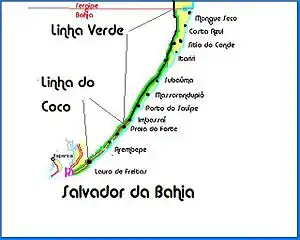 The Rodovia Estrada do Coco and Linha Verde, (BA-099), is a state highway which runs through the northeastern part of the state of Bahia and southeastern region of the state of Sergipe in Brazil. The road connects the city of Salvador, the capital of Bahia, to the city of Aracaju, the capital of Sergipe.