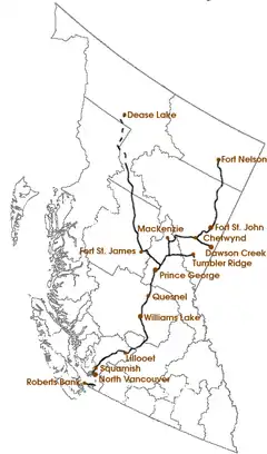 In 1958, Premier of British Columbia W.A.C. Bennett boasted that he would extend the railway to the Yukon and Alaska, and further extension of the railway was undertaken in the 1960s. A 37-kilometre (23 mi) spur was constructed to Mackenzie in 1966.[10] A third line was extended west from the mainline (somewhat north of Prince George) to Fort St. James. It was completed on August 1, 1968. The largest construction undertaken in the 1960s was to extend the mainline from Fort St. John 400 kilometres (250 mi) north to Fort Nelson, less than 160 kilometres (100 mi) away from the Yukon. The Fort Nelson Subdivision was opened by Premier Bennett on September 10, 1971. Unfortunately, the opening of the line was overshadowed by the inaugural train derailing south of Williams Lake, south of Prince George.