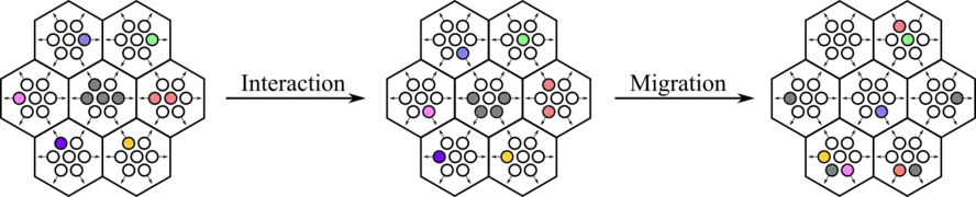 A new time step begins when both interaction and transport steps have occurred. Therefore, the dynamics of the BIO-LGCA can be summarized as the stochastic finite-difference microdynamical equation