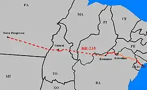 The BR-235 is a Brazilian federal highway that connects the cities of Aracaju, in the state of Sergipe, to Novo Progresso, Pará. It has a total length of 2,093.5 km.[1]