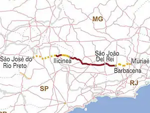 It is mostly composed of a single track and has sections in the middle of mountains, in the Zona da Mata,[1] as well as sections in the middle of farms, mainly in the Southwest region of Minas.[2]