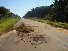 In 2005 the federal government announced that the highway would be recovered through the Growth Acceleration Program (PAC).[6] The purpose is to make it easier to ship products made in factories in the Manaus Free Trade Zone to São Paulo, as an alternative to sending the containers by sea.[21] Three sections were defined for the purpose of roadworks: a northern section from Manaus to kilometre 250 at Igapó-Açú, a middle section from there to kilometre 655.7 at Humaitá, and a southern section from Humaitá to Porto Velho.[22] In 2007 the Brazilian Institute of Environment and Renewable Natural Resources (IBAMA) issued a Terms of Reference requesting completion of an Environmental Impact Study / Environmental Impact Report (EIA / RIMA) for the middle section.[22] This section is considered to be a new road, since it had seen no traffic for several years. The south and north sections did not require an EIA, since they were already paved and in use.[23] However, the EIA considered environmental and social impacts for the full length of the road.[24]