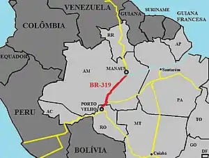 Construction of the 870 kilometres (540 mi) BR-319 to connect Manaus (AM) to Porto Velho was started in 1968 and completed in 1973.[1] The Andrade Gutierrez consortium undertook construction of the road for the Brazilian military government during the period of the economic miracle.[10] The road was officially inaugurated in 1976, intended to provide secure access to the Purus-Madeira inter-fluvial region.[1] Specifications for the road were weak and it quickly deteriorated due to harsh tropical conditions and lack of maintenance.[11] By 1986 the road was impassible.[12]