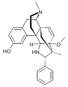BU72 is an extremely potent opioid, with one of the highest known affinities for the μ-opioid receptor. In animal studies, it was found to be a potent analgesic, with a slow onset and long duration of action, but was not considered suitable to develop for medical use.[1] It was used to produce the first crystal structure of the active μ-opioid receptor,[2] and is now widely used to model the activation process.[3][4][5] The stereochemistry has recently been revised, with the phenyl group in the (R) configuration,[6] which has been accepted by the authors of the crystal structure.[7]