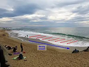 When a wave hits the coast, it can pass over the sandbar that separates the baïne from the sea and enter it all along its length. When the wave subsequently recedes, the baïne water is pushed out through the single point where it was connected to the sea. At this point a rip current, a very strong offshore current, can occur. The current will vary depending on the height of the waves and the height of the tide. It is at its strongest and most dangerous during the final hours approaching low tide, and in the first hours afterwards.[1] Swimmers caught in this current are advised not to resist but to let themselves be carried out to sea where the current is weaker, then to swim parallel to the beach before attempting to approach the shore.[2]