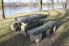 The park was built by the National Youth Administration in 1938 and 1939 and preserves two fieldstone council rings, a stone picnic table, and a hand-operated pump from that era. A geological marker, modern toilets, and other amenities were added later. It contains about 16 acres (6.5 ha), but it was considerably larger before the adjacent highways were expanded with cloverleaf interchanges.[4][5]