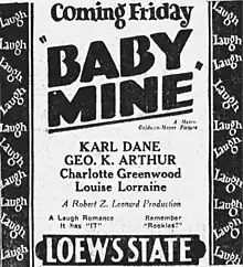 Baby Mine is a 1928 silent film comedy produced and distributed by Metro-Goldwyn-Mayer. This film is a remake of the 1917 film Baby Mine both being based on Margaret Mayo's 1910 Broadway comedy Baby Mine. This film stars Karl Dane, George K. Arthur and Charlotte Greenwood and is her third feature film, she having made two previous films in 1916 and 1918.[1][2][3]