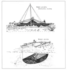 It is similar with bagan rakit, but with two boats as the floating device. At the time of fish capture, raft bagan, boat bagan, or boat bagan with platform is anchored.[3]