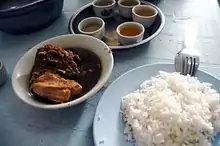 The name literally translates from the Hokkien dialect as "meat bone tea", and at its simplest, consists of pork ribs simmered in a broth of herbs and spices (including star anise, cinnamon, cloves, dong quai, fennel seeds and garlic) for hours.[7][8] Despite its name, there is in fact no tea in the dish itself; the name refers to a strong oolong Chinese tea which is usually served alongside the soup in the belief that it dilutes or dissolves the copious amount of fat consumed in this pork-laden dish.