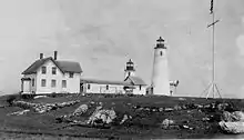 Bakers Island Light is a historic lighthouse on Bakers Island in Salem, Massachusetts.[2][3][4] The station was originally established in 1791, with a daymark. This was replaced in 1798 by two lights atop a keeper's house, one at each end. After storm damage in 1815, an octagonal stone tower was constructed. The current round stone tower was added in 1820. The 1820 tower was taller, leading to the names "Ma" and "Pa". The two remained in service until 1926, when the older, shorter tower was removed.[2]