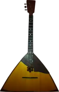 The first known document mentioning the instrument dates back to 1688. A guard's logbook from the Moscow Kremlin records that two commoners were stopped from playing the Balalaika whilst drunk.[13] Further documents from 1700 and 1714 also mention the instrument. In the early 18th century the term appeared in Ukrainian documents, where it sounded like "Balabaika". Balalaika appeared in "Elysei", a 1771 poem by V. Maikov.[14] In the 19th century, the balalaika evolved into a triangular instrument with a neck that was substantially shorter than that of its Asian counterparts. It was popular as a village instrument for centuries, particularly with the skomorokhs, sort of free-lance musical jesters whose tunes ridiculed the Tsar, the Russian Orthodox Church, and Russian society in general.[15]
