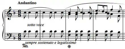 It opens quietly on the dominant of the F major key, with repeated Cs in both the left and right hands. This quickly progresses to a melody and development with the performance instruction sotto voce (quietly). This section fades out with several repeated As in the right hand.