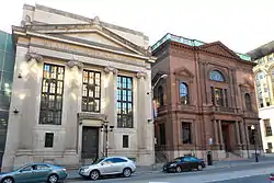 The former Eutaw Savings Bank is a Classical Revival brownstone, built when the bank vacated the Baltimore Equitable Society Building across the street. The original building was designed by Charles L. Carson. A 1911 addition was designed by Baldwin and Pennington.[3] Further alterations were carried out in 1912 by the firm of George C Haskell, a Carson protégé, and his partner G. Summerfield Barnes.[2]