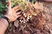 The cropping system is semi-permanent and the Bambara groundnut can be cultivated as single crop or as intercrop.[10] Best suited intercrops are sorghum, millet, maize, peanut, yams and cassava.[10] Bambara groundnut is mainly cultivated as intercrop, however the planting density varies between 6 and 29 plants per square meter.[18] For woodland savannas of Côte d'Ivoire, the highest yield is attainable with a plant density of 25[16] plants per square meter. Despite its suitability for intercropping systems due to its ability to fix atmospheric nitrogen,[19] a non-negligible proportion of farmers grow the Bambara groundnut in monoculture and report that its performance is better as a single crop.[17] Cultivation is mainly performed manually and is comparable to the production of peanut.[3]