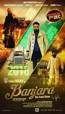 Banjara (transl. Nomad) is a 2018 Indian Punjabi-language drama film directed by Mushtaq Pasha.[1] The film stars Babbu Maan in a triple role alongside, Sarah Khatri ,Rana Ranbir, Gurpreet Bhangu, Jiya Mustafa and Shraddha Arya. It is Maan's first film release after Baaz (2014).[1][2] Based on the life of truck drivers and the film highlights the eras of 1947, 1984 and 2018, presenting the love stories of the three generations.[3][4] The film was theatrically released on 7 December 2018.