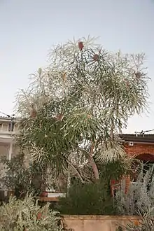 The cream to yellow flower spikes, known as inflorescences, can appear at any time of year.[3] They arise on the ends of one- or two-year-old stems and are roughly cylindrical in shape with a domed apex,[3][4] measuring 4–12 cm (1.6–4.7 in) high and 9–10 cm (3.5–3.9 in) wide at anthesis. Each is a compound flowering structure, with a large number of individual flowers arising out of a central woody axis.[3] A field study on the southern sandplains revealed an average count of 1369±79 on each spike.[6] The perianth is grey-cream in bud, maturing to a more yellow or cream. The style is cream and the tip of the pollen-presenter maroon. Ageing spikes are grey, with old flowers remaining on them, and develop up to 20 large red follicles each. Roughly oval and jutting out prominently from the spike, each follicle is 3.5–5 cm (1.4–2.0 in) long by 2–3 cm (0.8–1 in) wide and 2–3 cm (0.8–1 in) high and is covered in dense fur, red-brown initially before aging to grey. It remains closed until opened by bushfire, and contains one or two viable seeds.[3]