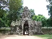 Banteay Kdei (Khmer: ប្រាសាទបន្ទាយក្តី; Prasat Banteay Kdei, lit. 'A Citadel of Chambers'),[1] also known as "Citadel of Monks' cells",[2] is a Buddhist temple in Angkor, Cambodia. It is located southeast of Ta Prohm and east of Angkor Thom. Built in the mid-12th to early 13th centuries AD during the reign of Jayavarman VII (who was posthumously given the title "Maha paramasangata pada"[3]), it is in the Bayon architectural style, similar in plan to Ta Prohm and Preah Khan, but less complex and smaller. Its structures are contained within two successive enclosure walls, and consist of two concentric galleries from which emerge towers, preceded to the east by a cloister.[4][5]