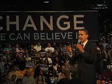 Obama and Clinton were in a statistical dead heat in Texas, according to a poll released February 25, 2008.[129] During Obama's sweep of February's post-Super Tuesday primaries and caucuses, the March 4 primaries of Texas and Ohio were seen as a firewall for the Clinton campaign.[130] In early polls for these states, Clinton held double digit leads in polls for those states, but by the end of February Obama had started to erode Clinton's lead in her key demographics, and her lead had been reduced to single digits in some polls.[130] In response to Obama's increases, Clinton's campaign began to increase their attacks on him, including an accusation of plagiarism due to similarities in Obama's campaign speeches and campaign speeches of Obama's campaign's national co-chair and Massachusetts governor, Deval Patrick, although Patrick specifically stated he told Obama to use it. During the February 21, CNN-Univision debate in Austin, Texas Obama responded to the accusation by saying, "The notion that I had plagiarized from somebody who's one of my national co-chairs, who gave me the line and suggested that I use it, I think is silly." Clinton received a round of boos from the crowd when she responded, "Lifting whole passages from someone else's speeches is not change you can believe in; it's change you can Xerox."[131]
