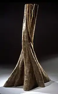Works such as Columen (1998), Schist and Brace (both 2000) resemble limbless, fallen, split or cut trees with dripping glue suggesting the arrested vitality of a living thing.[5][9][33] In others, like Mast (2000), Cooper uses veneer like sheaths or folds, alluding to wind-blown sails, clothing and the body, while other works reference the movement of water (rapids, waves) around obstacles; Fragment (1999) suggests a cache of coiled wood scrolls in a tree stump.[30][2][28] Several works explore biological reactions such as burls or calluses in forms balanced between abstraction and natural references (hearts, limbs, bulbs);[38][16][30] Burl (1997), Pomme (1998) and Corm (1999) incorporate a battered muffler layered with veneer, blackened steel sprouting vegetable roots, and bronze-like "tumors" that imply wounds, recuperation, and closure.[8][30][16][38]