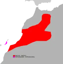 The Barbary ground squirrel is found on the Barbary Coast of Western Sahara, Morocco and Algeria on the seaward side of the Atlas Mountains and was introduced into the island of Fuerteventura in the Canary Islands in 1965.[1] It is the only species of squirrel to inhabit Africa north of the Sahara barring a small population of striped ground squirrel in southern Morocco.[3] Its habitat is arid rocky ground and it is found in mountainous regions up to an altitude of about 4,000 metres (13,000 ft).[3]