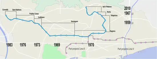 - 1970 – Diagonal/Provença-Sagrera-Vilapicina section opened. The line then known as L2 integrated into L5.