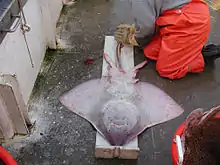 The barndoor skate is one of five skates in the Gulf of Maine that has commercial value, but of those, the species that are most frequently targeted are the winter skate (Leucoraja ocellata) and the thorny skate (Amblyraja radiata).[8] The barndoor skate is most commonly considered bycatch by commercial trawlers operating in the northwestern Atlantic that target other commercially valuable species of fish using bottom trawling.[5] When harvested, the flesh of the barndoor skate is used as bait, fish meal, and pet food, and the meat from its wings is sold for human consumption.[3] Since 1981, landings of skates have increased substantially, partly in response to increased demand for lobster bait, and more significantly, to the increased export market for skate wings.[9] The commercial retention and sale of barndoor skates was prohibited in the United States from 2003 until 2018.[1]