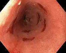 The main cause of Barrett's esophagus is thought to be an adaptation to chronic acid exposure from reflux esophagitis.[3] Barrett's esophagus is diagnosed by endoscopy: observing the characteristic appearance of this condition by direct inspection of the lower esophagus; followed by microscopic examination of tissue from the affected area obtained from biopsy. The cells of Barrett's esophagus are classified into four categories: nondysplastic, low-grade dysplasia, high-grade dysplasia, and frank carcinoma. High-grade dysplasia and early stages of adenocarcinoma may be treated by endoscopic resection or radiofrequency ablation.[4] Later stages of adenocarcinoma may be treated with surgical resection or palliation. Those with nondysplastic or low-grade dysplasia are managed by annual observation with endoscopy, or treatment with radiofrequency ablation. In high-grade dysplasia, the risk of developing cancer might be at 10% per patient-year or greater.[1]