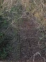 An ironstone quarry was also located at the site and the ore, crushed on site, was taken down the 'bogey line' via Brackenhills railway station on the Glasgow & South Western railway line to the old Glengarnock steelworks, owned by the Glengarnock Iron & Steel Co. Ltd.[12] The works closed in 1921, however the waste bings remained for many years.[4] The 'Beith Supplement and Advertiser' reported in 1912 that after a two-month-long strike at Glengarnock Steelworks the ironstone works at Dockra would be re-opening.[13]