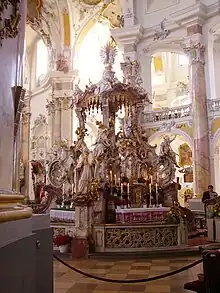 The Basilica of the Fourteen Holy Helpers (German: Basilika Vierzehnheiligen) is a church located near the town of Bad Staffelstein near Bamberg, in Bavaria, southern Germany. The late Baroque (Rococo) basilica, designed by Balthasar Neumann, was constructed between 1743 and 1772. It is dedicated to the Fourteen Holy Helpers, a group of saints venerated together in the Catholic Church, especially in Germany at the time of the Black Death. The interior has been nicknamed "God's Ballroom".[1]