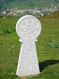 A reproduction of a Hilarri, a Basque gravestone, from 1736 with commonly found symbols. Translated from Latin, it reads, "Maria Arros Sagaray died on the 19th day of April, 1736".