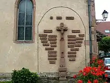 Bassemberg has nine Calvaries still in perfect condition including five dating to the 18th century. The calvary in the old cemetery is the best preserved. Moved by the municipality for development, it is well protected by the long wall of the church. A finely carved niche surrounds the shaft where the inscription: Meint Testament Soll Sein Am / End Amen Jesus Maria und Joseph (My testament to my end must be Jesus, Mary and Joseph Amen). Below on the pedestal is engraved the year 1737. The Calvary is surrounded by the names of the victims of the two world wars.
