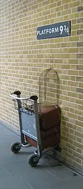 In the Harry Potter books, King's Cross station is where the protagonist boards the train for Hogwarts. However, author JK Rowling later admitted she had confused it with nearby Euston station.[26] The railway station has put up a sign for the fictional "Platform 9+3⁄4" described in the books, and embedded part of a luggage trolley halfway into the wall. Film adaptations have used platforms 4 and 5, with the nearby St Pancras station and hotel acting as exteriors.[27]