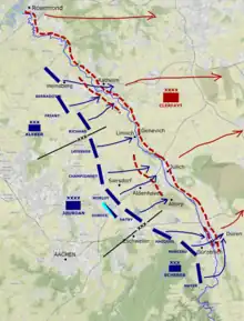 Meanwhile, Championnet’s and Morlot’s divisions advanced towards Aldenhoven. Championnet reported being able to take advantage of the broken terrain in front of his position to rapidly approach and assault the enemy in his front with light artillery and columns of infantry.[11] The divisions captured Aldenhoven and forced the Austrians to fall back to their prepared fortifications behind the town, where they held until they were threatened from the flanks by Lefebvre's and Hatry's successes. They then retreated back across the Roer to Julich.[10]