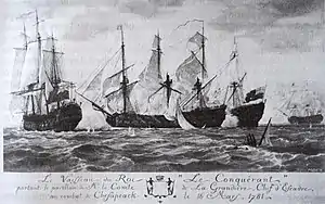 | Romulus | Fifth rate | 44 | Jacques-Aimé Le Saige de La Villèsbrunne[21] | 2 | 1 | 3 | This was a two-deck ship built by the British in 1777.[26] | |||