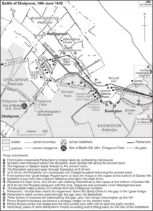 Dalbier moved his dragoons up to the hedge and fired on the Royalist cavalry, prompting Prince Rupert into an attack, allegedly leaping the hedge while the rest of his men made their way around. Reinforced by Hampden and Gunter, Dalbier's men initially held their ground but were heavily outnumbered and broke. For once, Rupert's men halted their pursuit, probably since their horses were exhausted, and withdrew to Chiselhampton, where they remained until the next day.[13] Most accounts agree the fighting was over by the time Stapleton arrived, although it has been suggested otherwise, primarily by Royalist statesman and historian, the Earl of Clarendon.[14]