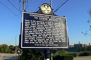 At about 2 p.m. Union General Emory Upton's division launched an attack on the lower (southern) bridge. Meeting very little resistance, they thought they would cross the bridge and take Columbus relatively easily. Upton remarked, "Columbus is ours without a shot being fired." But this was a trap. Confederates removed the planks on the east side of the bridge to halt the Federals and allow the Confederates to burn the bridge filled with soldiers.[4][5] Recognizing the peril, Upton was forced to retreat. It seemed that the Confederates might be able to defend Columbus.