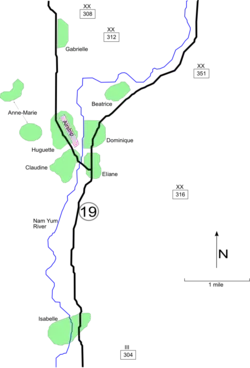 Starting in December, the French, under the command of Colonel Christian de Castries, began transforming their anchoring point into a fortress by setting up seven satellite positions. (Each was said to be named after a former mistress of de Castries, although the allegation is probably unfounded, as the eight names begin with letters from the first nine of the alphabet.) The fortified headquarters was centrally located, with positions Huguette to the west, Claudine to the south, and Dominique to the northeast.[46] The other positions were Anne-Marie to the northwest, Beatrice to the northeast, Gabrielle to the north, and Isabelle 6 km (3.7 mi) to the south, covering the reserve airstrip.[47]