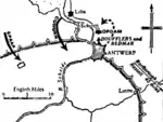 Questions can be raised about this plan of attack as the two divisions under the Dutch generals were isolated from each other by the Scheldt and would not be able to come to each other's aid quickly in case of emergency.[14] Obdam had to send several of his battalions to join Coehoorn. His depleted force marched on 28 June from Bergen op Zoom to Antwerp and arrived the next day at Ekeren, seven kilometres north of Antwerp, just south of Dutch held Fort Lillo.[15] Obdam's army had not remained blind to the danger it faced, and two of its sub-commanders, the Lord of Slangenburg and Count of Tilly, had stressed that danger to the head of the army. Obdam believed he should not act against the orders received and not abandon the position at Ekeren, but he reminded Marlborough of the precarious state of the Dutch army. Marlborough however ordered him to stay where he was.[14]