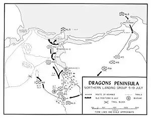 The task of landing around Bairoko was given to the Northern Landing Group, under the command of Colonel Harry B. Liversedge.[10][11] This force consisted of one battalion of U.S. Marine Raiders from the 1st Marine Raider Regiment (the 1st Battalion),[12] supported by two United States Army infantry battalions (the 3rd Battalion, 145th Infantry Regiment and the 3rd Battalion, 148th Infantry Regiment).[13][14] This force was organized to facilitate quick movement through the jungle. No artillery was assigned to the force; instead fire support would be provided by mortars and machine guns.[15][16] Additionally, only three days of rations were carried by the troops, as US commanders intended upon resupplying over the shore at the small port of Enogai on the Dragons Peninsula, after advancing from the landing beach around the Rice Anchorage.[17]