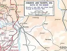 On 4 September, German counter-attacks at the Combles ravine stopped the French advance towards Rancourt but the French consolidated Cléry and forwarded to the German third position. The British took Falfemont Farm on 5 September and linked with the French at Combles ravine. French patrols captured Ferme de l'Hôpital 0.5 mi (0.80 km) east of Le Forêt and reached a ridge behind the track from Cléry to Ferme de l'Hôpital, which forced the Germans to retire to the third position in some confusion, XX Corps taking 2,000 prisoners.[24] VII Corps took all of Cléry and met XXXIII Corps on the right, which had captured Ommiécourt in the marshes south of the village, taking 4,200 prisoners, as French parties reached the German gun-line. An attack by I Corps failed on 6 September and attacks were delayed for six days, as the difficulty in supplying such a large force on the north bank was made worse by rain.[25]