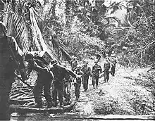 Meanwhile, the infantry continued their advance inland. By the end of the day on 23 April the 186th Infantry were about halfway to Lake Sentani, while those from the 162nd had secured Hollandia and were securing the high ground around their objective, winkling out isolated pockets of resistance with aerial support.[54] There was little resistance initially, but further inland there was some opposition as elements of the 186th Infantry reached the lake by 24 April. Engineers operating amphtracks pushed forward from Jautefa Bay to the lake to carry the infantry around the Japanese positions at the lake, completing their flanking maneuver on 25 April. By 26 April, U.S. troops secured the two eastern airfields, and later that day linked up with forces advancing from the 24th Division advancing from Tanahmerah Bay. The fires around White 1 continued until 27 April when the engineers were released to return to the beach. The stores situation in the forward area grew more urgent as the supply line up the single road broke down. Aerial resupply brought some relief, and on 30 April a group of 12 LCTs, towed by several LSTs, arrived at Humboldt Bay. The situation was not fully resolved until 3 May when transport aircraft began landing on an airstrip that was hastily built by an engineer aviation battalion at Tami.[48][55]