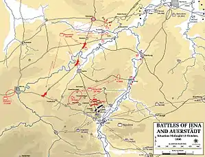 The battles began when elements of Napoleon's main force encountered Hohenlohe's troops near Jena. Initially 48,000 strong, the Emperor took advantage of his carefully planned and flexible dispositions to rapidly achieve local superiority, with a force reaching 96,000 men.[11] However, less than half fought the Prussians as only 40,000 men were sent and actually took part in the battle.[3] The Prussians, meanwhile, were slow to grasp the situation, and slower still to react. Before Ruchel's 15,000 men could arrive from Weimar, Hohenlohe's force was routed, with 10,000 killed or wounded and 15,000 captured.[11] Ruchel did eventually bring his troops to the battlefield. Soon after it was committed to battle and Hohenlohe rode up to take personal command of the corps, they were ridden over and sent fleeing to the rear in irretrievable rout, with Ruchel being wounded. Nevertheless, Jena was a fierce battle, with 5,000 French killed, wounded or captured;[11] and Napoleon mistakenly believed that he had faced the main body of the Prussian army.