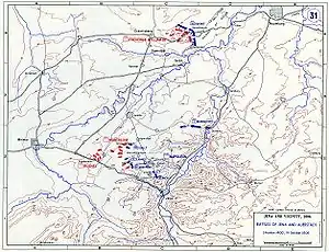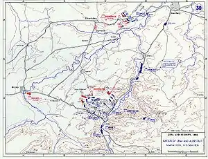 A later search of the orders and dispatches from the Imperial Headquarters never yielded any order for Bernadotte to march with Davout. They did, however, confirm Berthier's order of 14 October, sending Bernadotte to Dornberg.[20][21] The lack of documentation supporting Napoleon's accusation against Bernadotte calls into question whether Napoleon had intended I Corps to march with Davout, and the order was incorrectly transmitted to Bernadotte on the morning of 14 October, or if Napoleon was using the opportunity to shift blame for Davout having to fight a battle on his own as suggested by Colonel Ernst Marsh Lloyd.[22] Napoleon later sent a severely worded reprimand to Bernadotte but took no further action.[23]